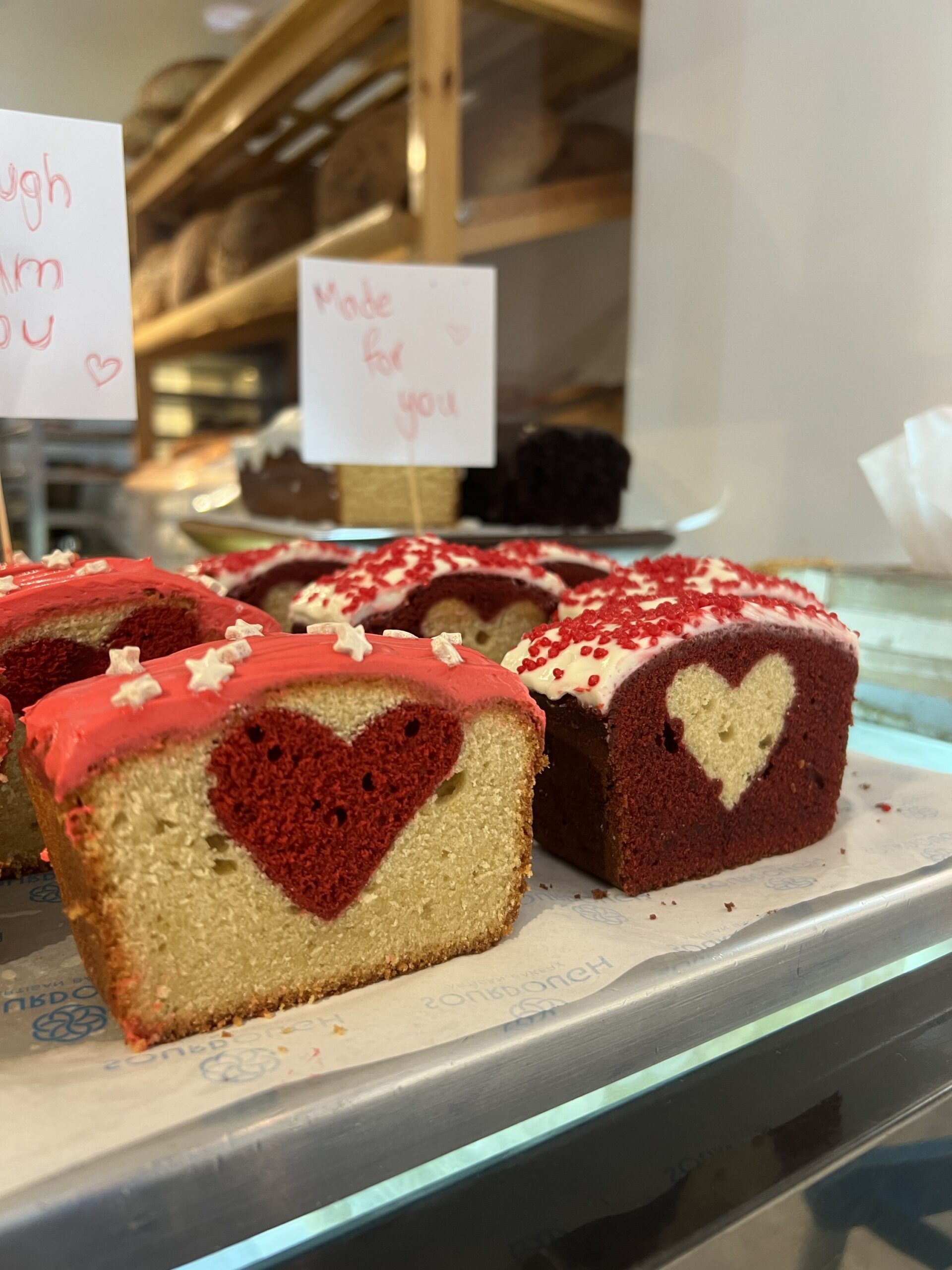 A moist vanilla cake hiding a red heart inside, finished with a delicate glaze — a sweet surprise in every slice.